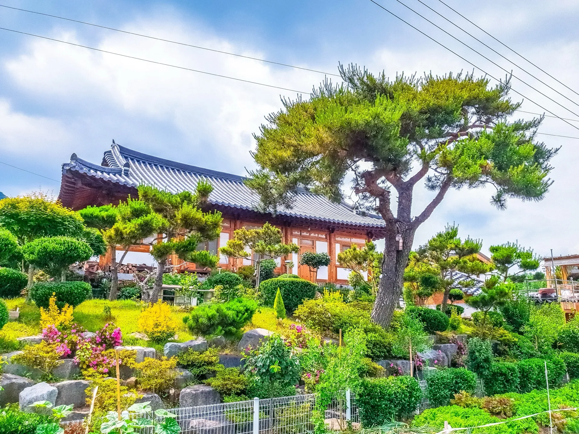 꽃이 만발하는 정원과 150년 된 소나무가 어우러진 고풍스러운 한옥이 있습니다.